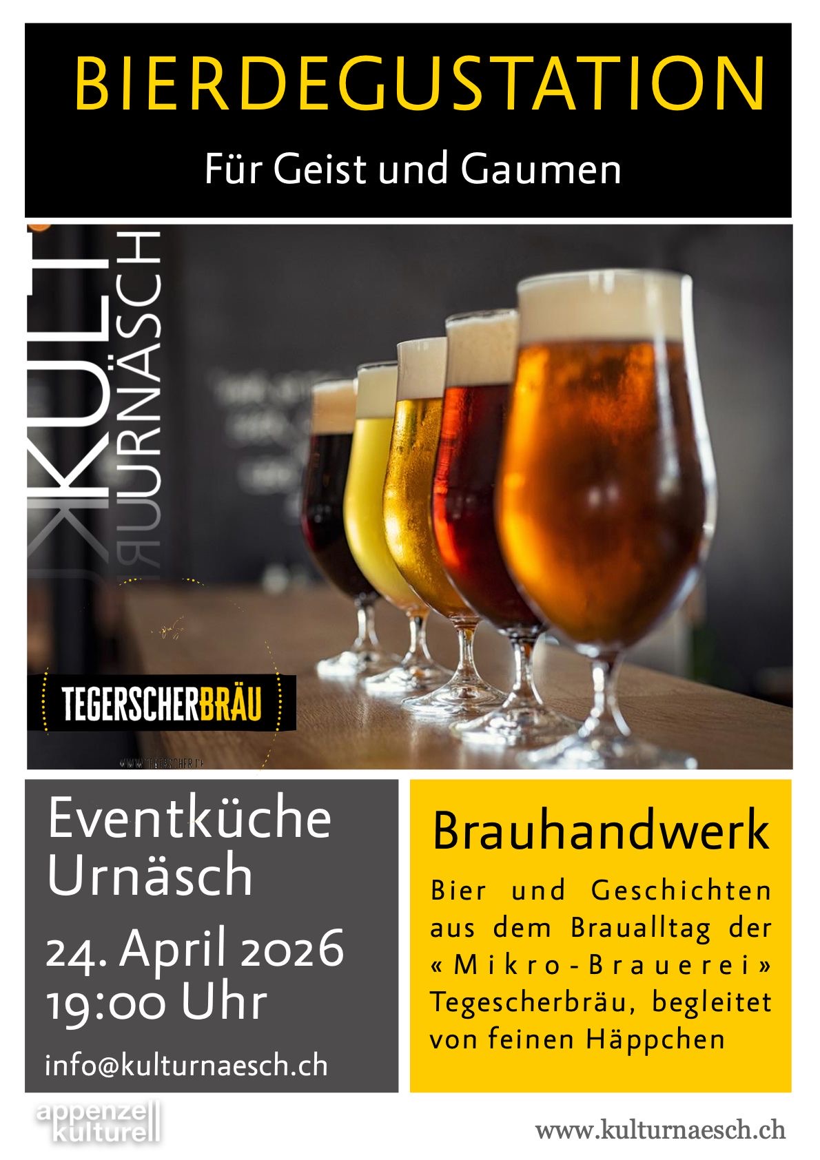 Am Freitag, 24. April 2026 ab 19.00Uhr findet in der Eventküche Urnäsch unsere Bier Degustation statt.